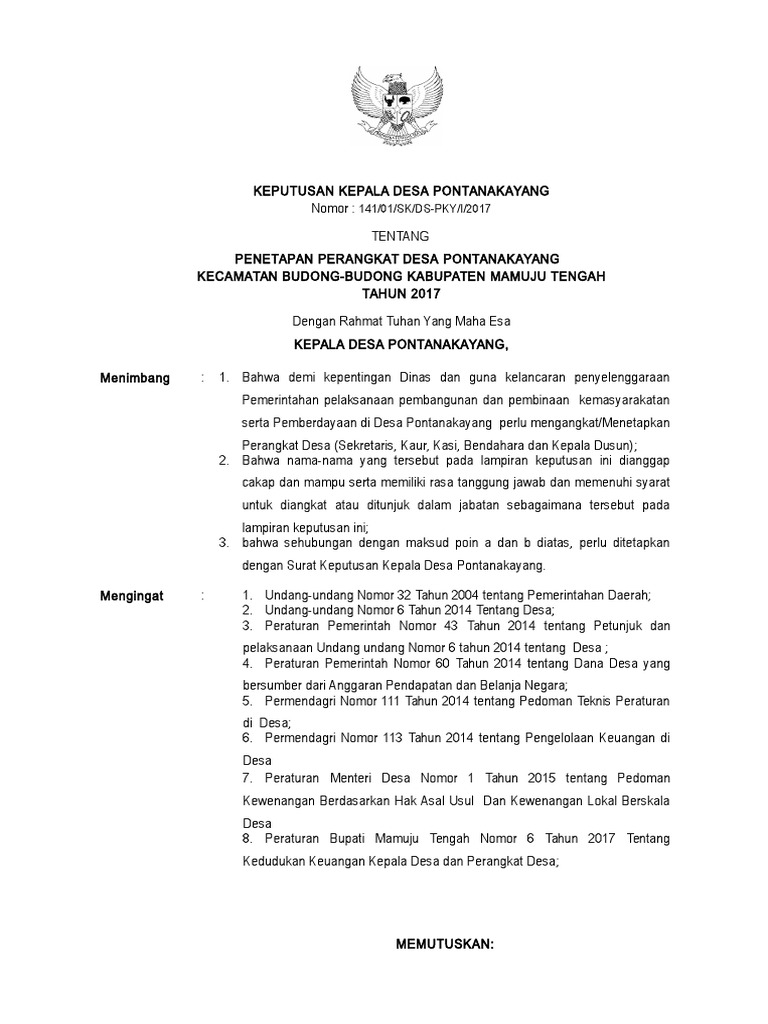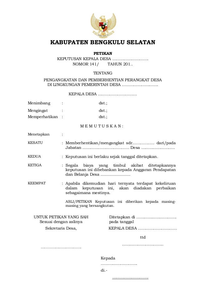 Mekanisme pengangkatan perangkat desa, telah diatur dalam peraturan menteri dalam negeri nomor 83 tahun 2015 tentang pengangkatan dan pemberhentian perangkat desa. Perincian contoh sk pemberhentian perangkat desa tahun 2018 doc pdf dapat anda nikmati dengan cara klik pautan muat turun di bawah dengan Pemberhentian kaur umum dan kepala dusun. Dalam tulisan ini sobat desa akan menemukan contoh sk. Bahwa berdasarkan pasal 4 ayat (1) peraturan daerah kabupaten pemalang nomor 2 tahun 2015, jabatan perangkat desa kosong karena perangkat.