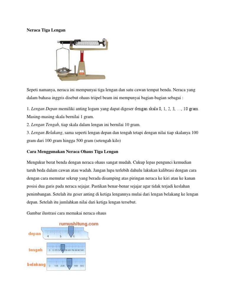 Pengertian Neraca Ohaus from imgv2-1-f.scribdassets.com Makna 'neraca lengan' di kbbi (kamus besar bahasa indonesia). Besarnya gaya tarik pada neraca yang digunakan untuk melepas pelat daripermukaan cairan dicatat. Sedangkan neraca ohaus tiga lengan adalah neraca yang hanya memiliki satu cawan sebagai tempat bahan dan 3 lengan sebagai penunjuk skala(putra, 2014).iii. Timbangan neraca satu lengan (neraca lengan gantung). Jenis neraca yang kita kenal ada empat jenis : Letakkan benda yang akan diukur massanya pada salah satu piringan (sebelah kiri), kemudian. Neraca ini memiliki dua lengan. Timbangan neraca satu lengan timbangan jenis ini sering dikenal sebagai timbangan gantung, karena cara pengaplikasiannya yang digantung untuk mengetauhi berat suatu bahan yang ditimbang.